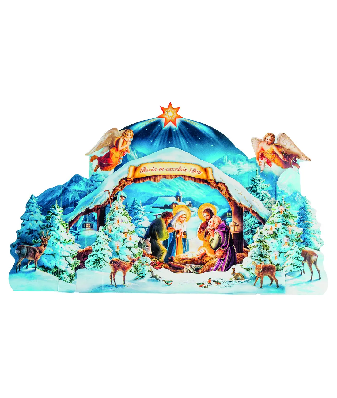 Papírový jednoduše rozložitelný betlém - jesličky, kde nechybí žádná důležitá postava z příběhu narození Ježíše, s obálkou.
