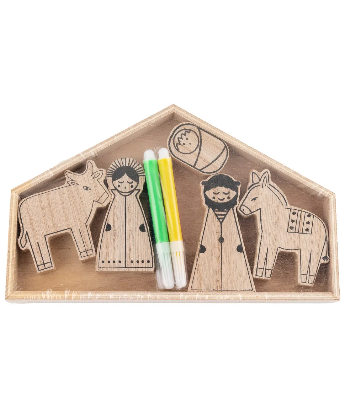 Soubor jednoduchých dřevěných figurek v Betlémě, které si děti mohou sami vybarvit