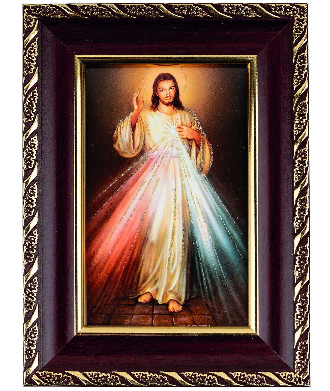 Obraz Ježíše Milosrdného ve zdobném plastovém rámečku.