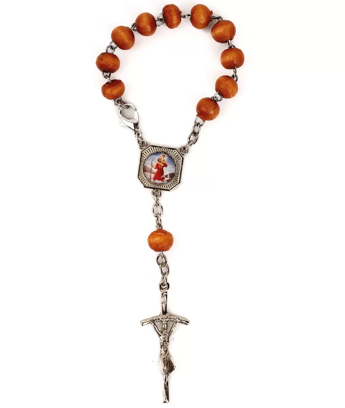 Desátek jako přívěšek se zapínáním s kulatými dřevěnými korálky v barvě ořechu o průměru 0,5 cm, s medailkou sv. Kryštofa a na rubu Srdce Ježíšova. Doplněno stříbrným křížkem o velikosti 3 cm.