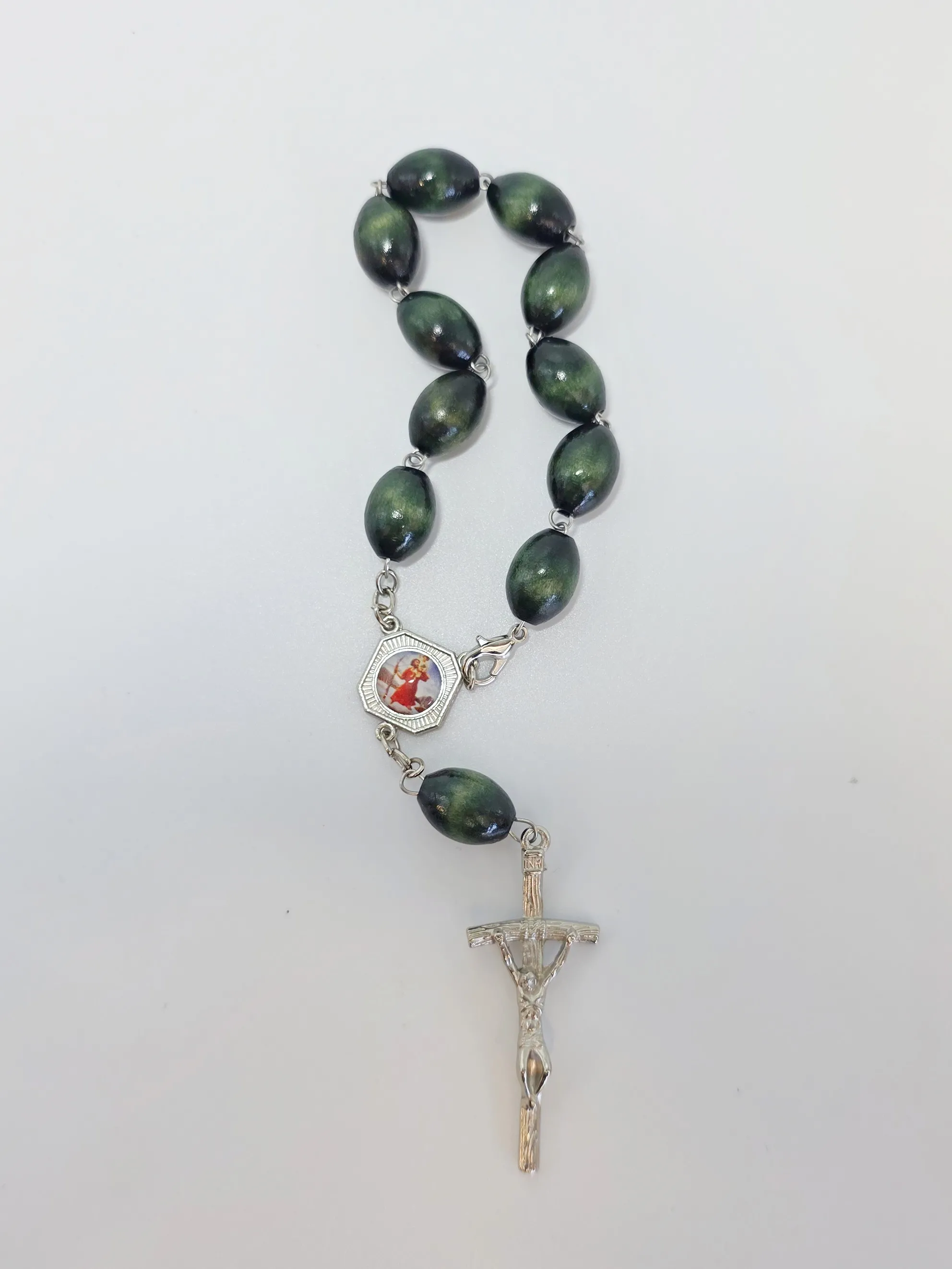 Desátek jako přívěšek se zapínáním s tmavě zelenými oválnými dřevěnými korálky o průměru 0,8 cm, s medailkou sv. Kryštofa a na rubu Srdce Ježíšova. Doplněno stříbrným křížkem o velikosti 4,5 cm. Svatý Kryštof je patronem motoristů a všech cestujících, letců, lodníků, námořníků, obchodníků, atletů, lékařů, horníků, tesařů, kloboučníků, barvičů, knihařů, zahradníků, dětí; vzýván je při nepříznivém počasí, proti nákazám a živelným pohromám i proti náhlé a nekající smrti