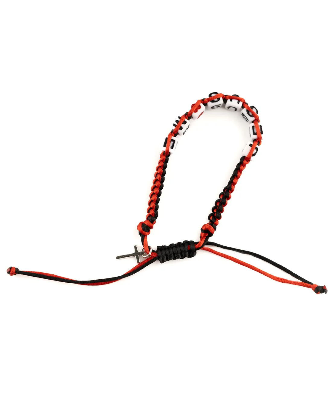 Drhaný náramek v červeno černé barvě s nápisem na korálkách ve tvaru kostky.