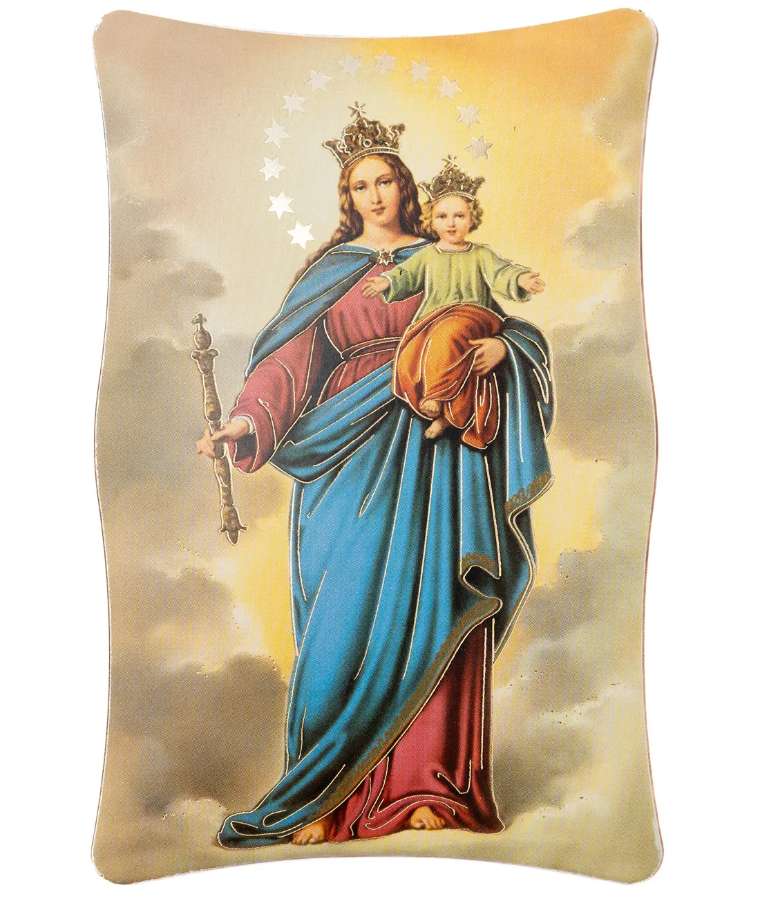 Dřevěná ikona určená k zavěšení na zeď nebo k postavení na stůl. Mariino poslání pomocnice křesťanů vyvěrá jako některé další svátky z ustanovení jejího Syna, aby nám byla Matkou. Mezi její nejvýznamnější pomoc patří pomoc v hodině smrti. Je patrná zejména u jejích ctitelů. Mnozí z nich se dopustili nevěrností a vzdálili se, ale protože ji jednou s důvěrou svěřili svou duši, ona jim před smrtí pomohla. A tam je to pro každého z ná…s nejdůležitější.