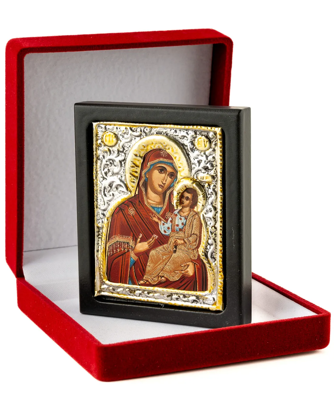 Přesná kopie staré byzantské ikony, na plátně v původních, trvanlivých barvách. Ke zdobení použito ryzí stříbro Ag 925/1000. Vyrobeno v Řecku místními umělci.