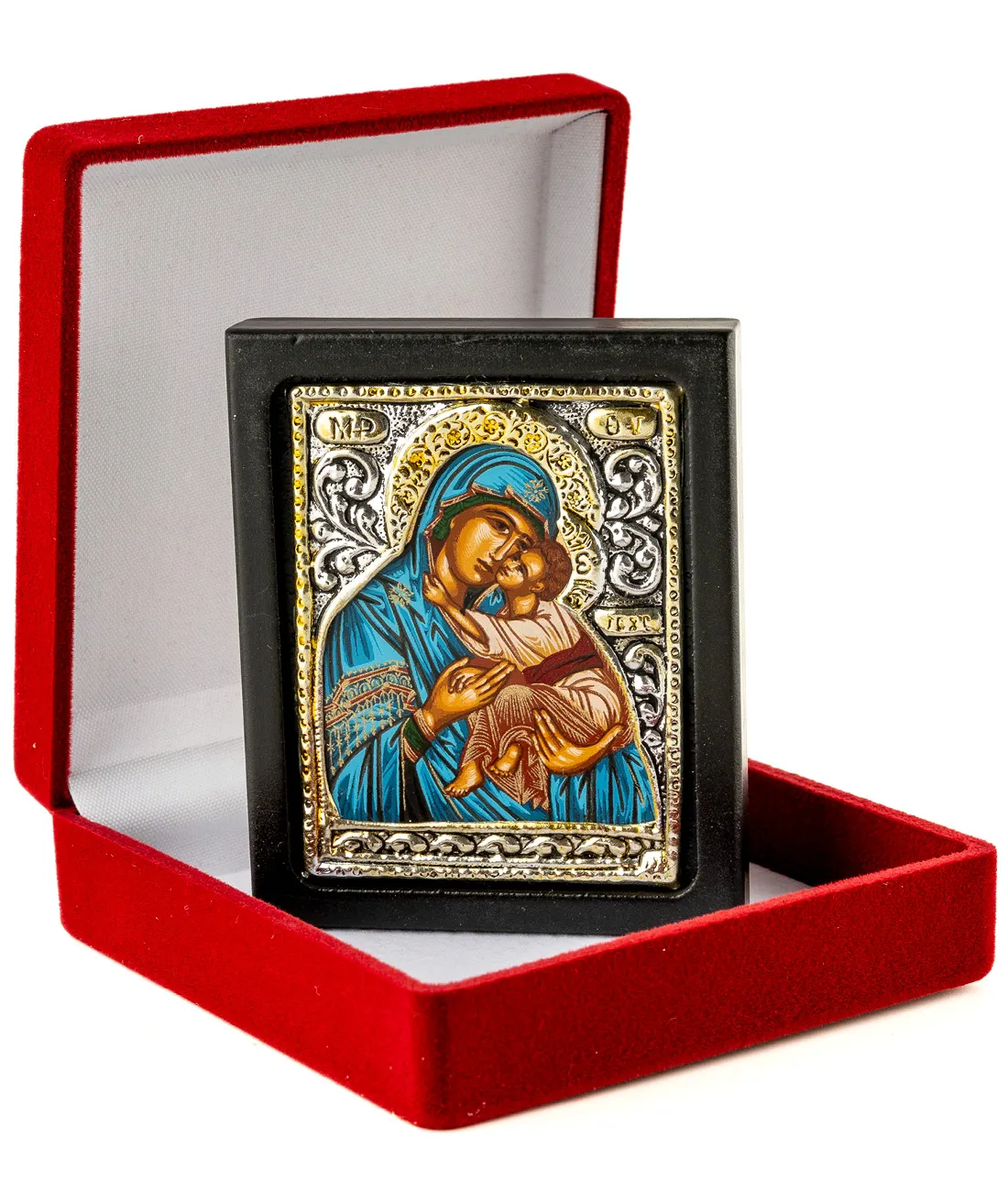 Přesná kopie staré byzantské ikony, na plátně v původních, trvanlivých barvách. Ke zdobení použito ryzí stříbro Ag 925/1000. Vyrobeno v Řecku místními umělci. Uloženo v dárkové krabičce.