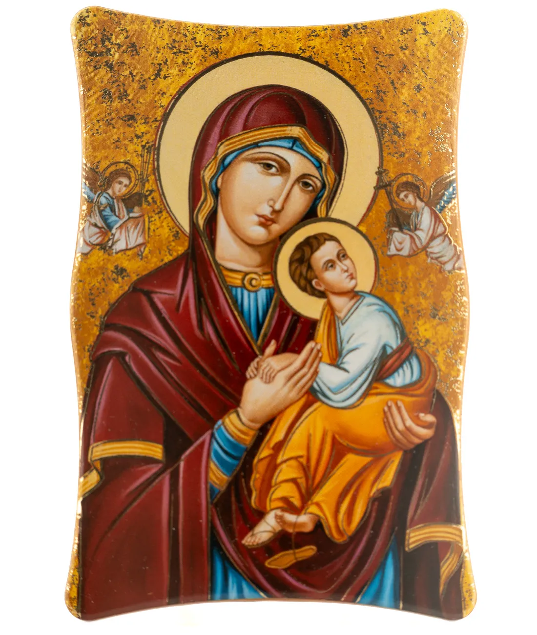 Dřevěná ikona určená k zavěšení na zeď nebo k postavení na stůl.