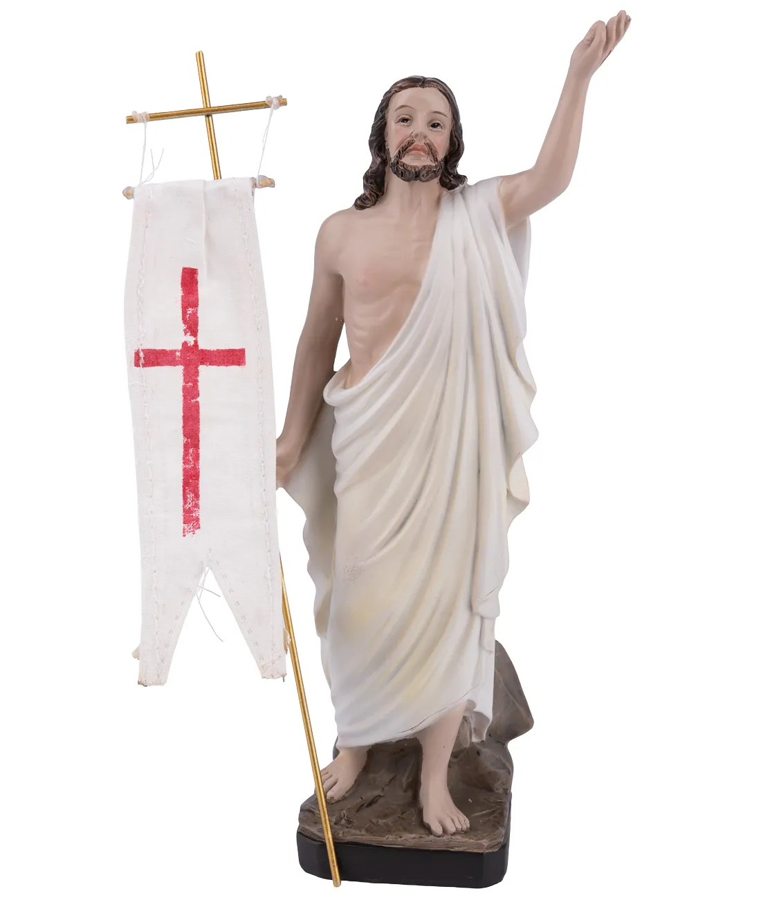 Jemně kolorovaná soška Ježíše Zmrtvýchvstalého vyrobená z umělé pryskyřice, vysoká 20,5 cm.