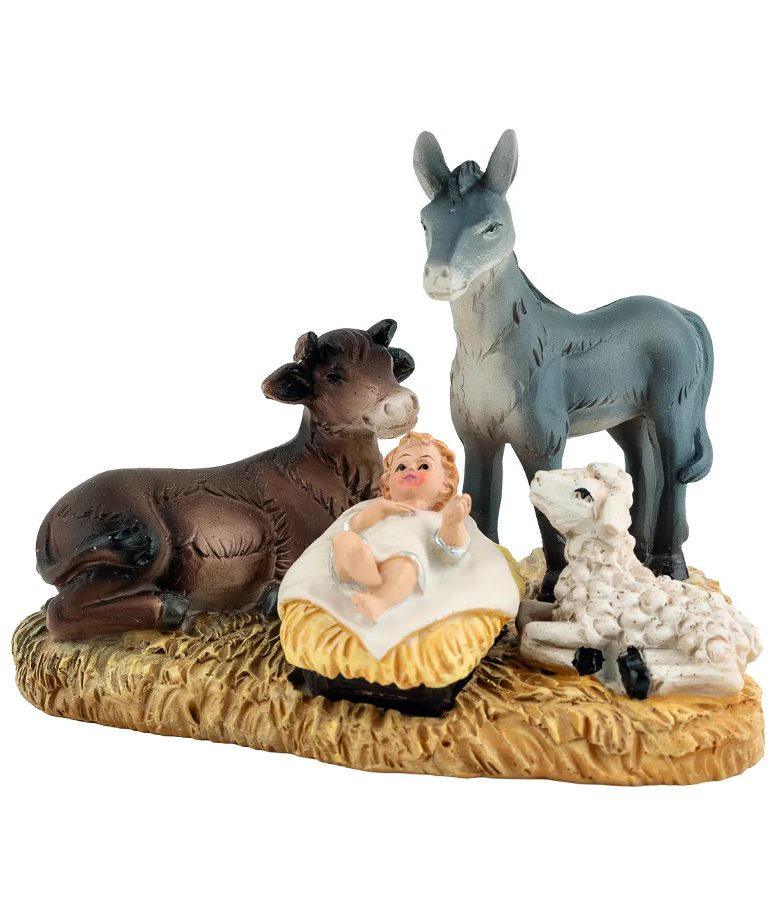 Roztomilá barevná soška Ježíška v jesličkách, který je obklopen volkem, oslíkem a ovečkou