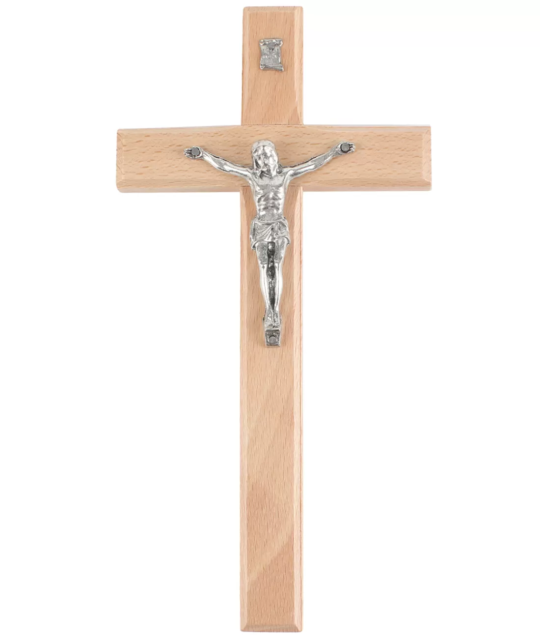 Jednoduchý kříž ze světlého dřeva, s jemně zkosenými hranami, se stříbrným kovovým korpusem, o velikosti 20 cm.