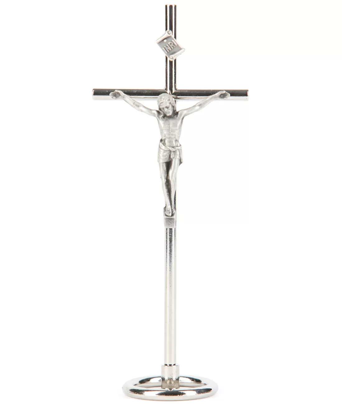 Kovový stříbrný stojací kříž s korpusem a kulatou základnou. Velikosti 15,5 cm.