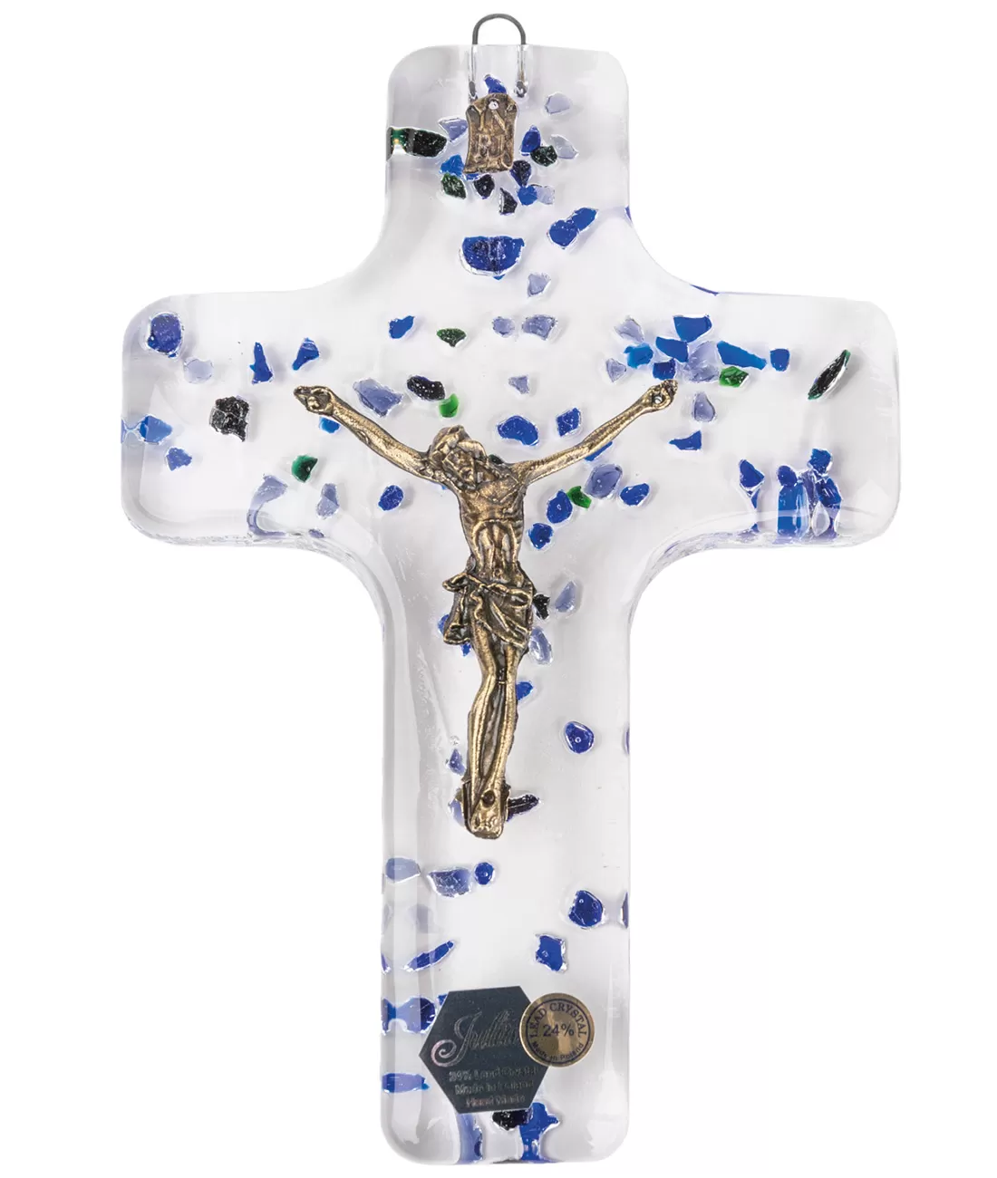 Luxusní, ručně vyrobený umělecký kříž z křišťálového skla s decentním modrým dekorem a zlaceným korpusem. Sklo s obsahem 24% oxidu olovnatého dodává sklu vyšší lesk a odolnost. Velikost 18,5 cm