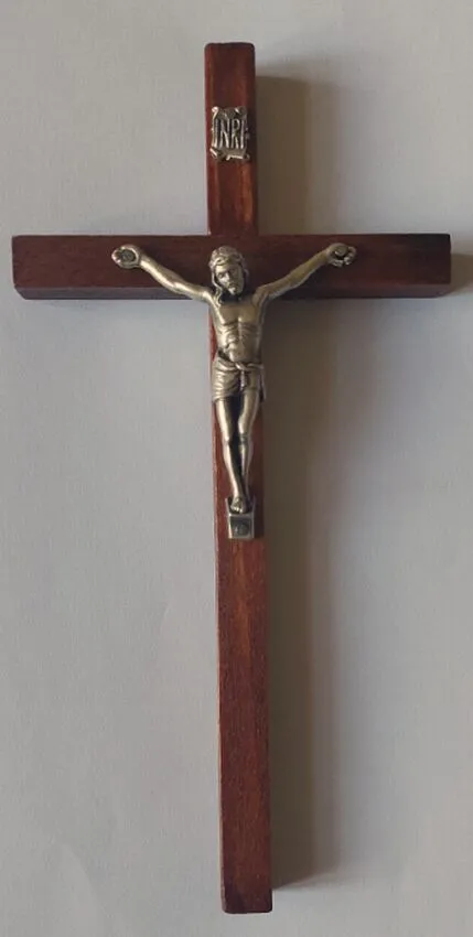 Úzký kříž z tmavého dřeva s kovovým stříbrným korpusem o velikosti 18 cm.