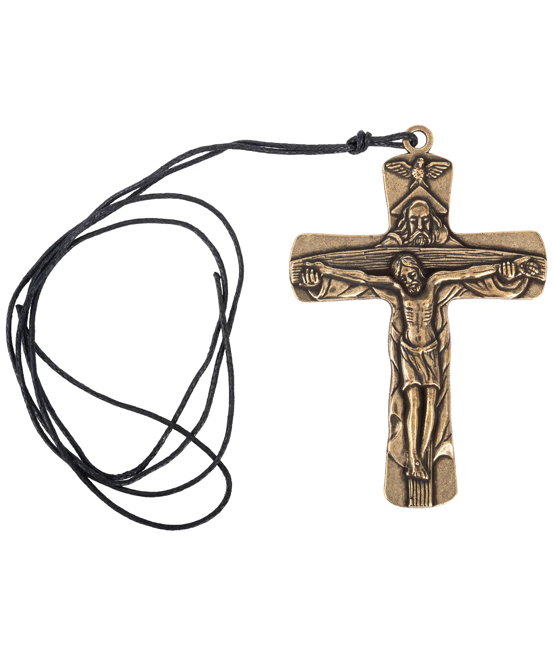 Kříž Nejsvětější Trojice v barvě mosazi stříbrné se šňůrkou, výška 9 cm.