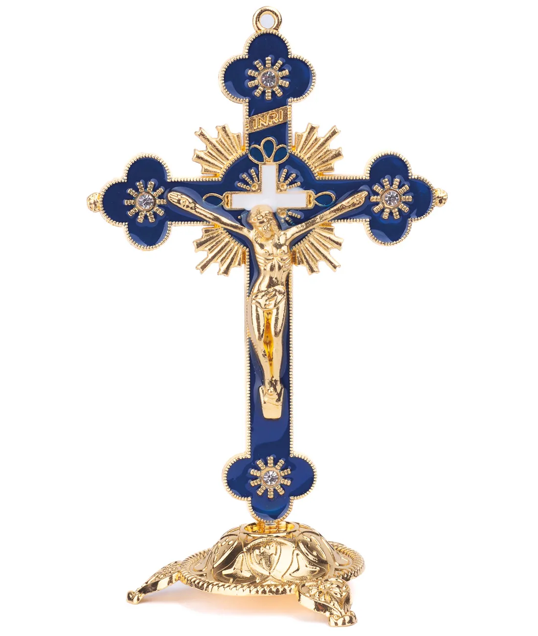 Kříž stojací kovový v krabičce, barva modrozlatá, 14 cm