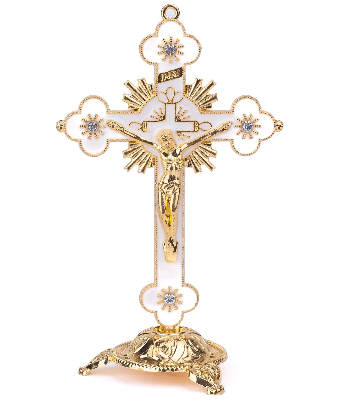 Kovový zdobený kříž o výšce 14 cm. Je možné ho s použitím stojánku postavit nebo pomocí očka zavěsit na zeď.