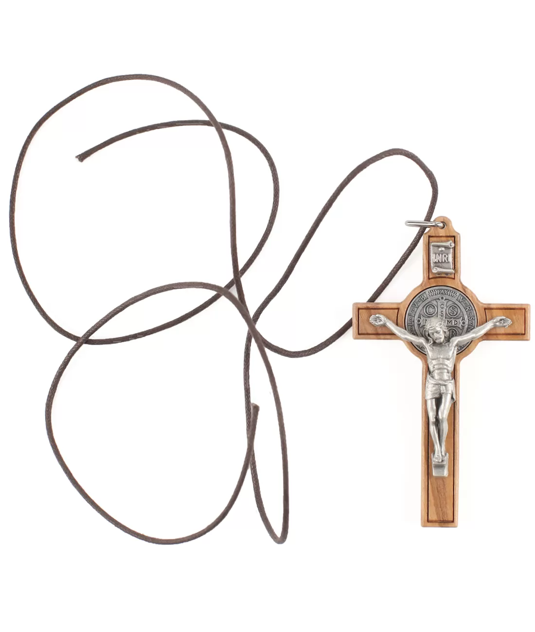 Kříž svatého otce Benedikta v dárkové krabičce, na kožené šňůrce o velikosti 7,5cm. Symbolika medailky vychází z duchovních zkušeností sv. Benedikta, který znamením kříže a modlitbou zažehnával mocnosti zla. Proto je na jedné straně vyobrazen kříž sv. otce Benedikta s počátečními písmeny modlitby exorcismu. Mezi rameny kříže proto nacházíme písmena C S P B: Crux Sancti Patris Benedicti – Kříž svatého otce Benedikta. Na svislém břevnu C S S M L: Crux Sancta Sit Mihi Lux – Svatý kříž mi bu…ď světlem. Na příčném břevnu N D S M D: Non Draco Sit Mihi Dux – Drak (tj. ďábel) ať mi není vůdcem. Na lemu kolem kříže jsou písmena V R S N S M V S M Q L I V B: Vade Retro Satana Numquam Suade Mihi Vana Sunt Mala Quæ Libas Ipse Venena Bibas – Odstup dále Satane a nikdy mi neraď. Marné je zlo, které nabízíš, ten jed si vypij sám. Na druhé straně je pak vyobrazen samotný světec doprovázen textem: Eius in obitu nostro praesentia muniamur! – Jeho (Benediktova) přítomnost ať nás chrání při našem umírání. Více informací najdete např. na webu Břevnovského kláštera: https://www.brevnov.cz/cs/benediktini-a-brevnovsky-klaster/kriz-svateho-otce-benedikta
