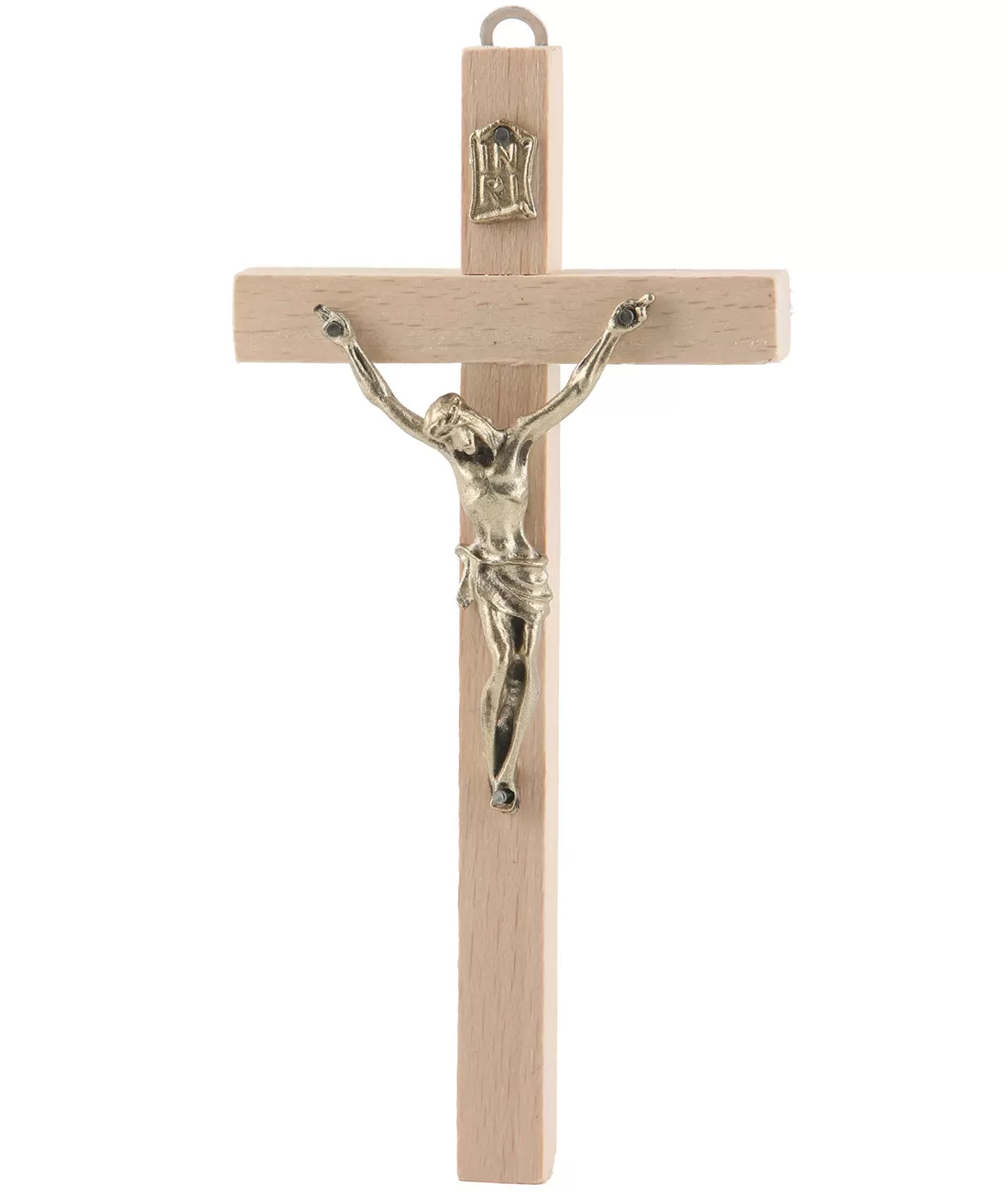 Jednoduchý kříž ze světlého dřeva se zlatým kovovým korpusem o velikosti 13,5 cm.
