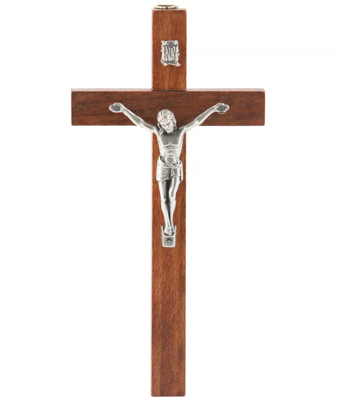Jednoduchý kříž z tmavého dřeva se stříbrným kovovým korpusem o velikosti 20 cm.