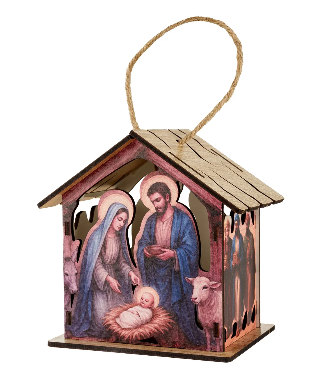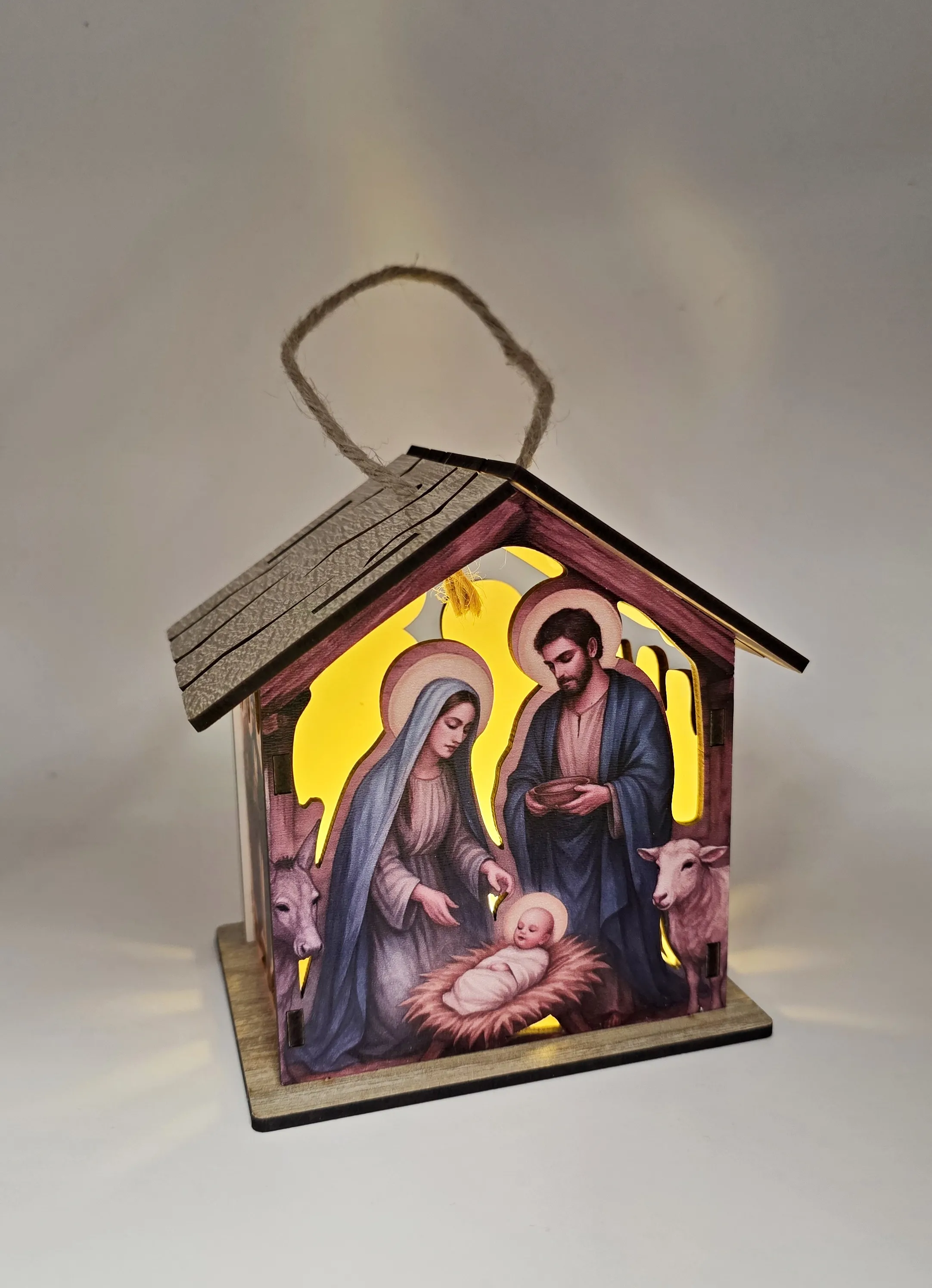 Dřevěná lucernička jako Betlém se Svatou rodinou a třemi králi.