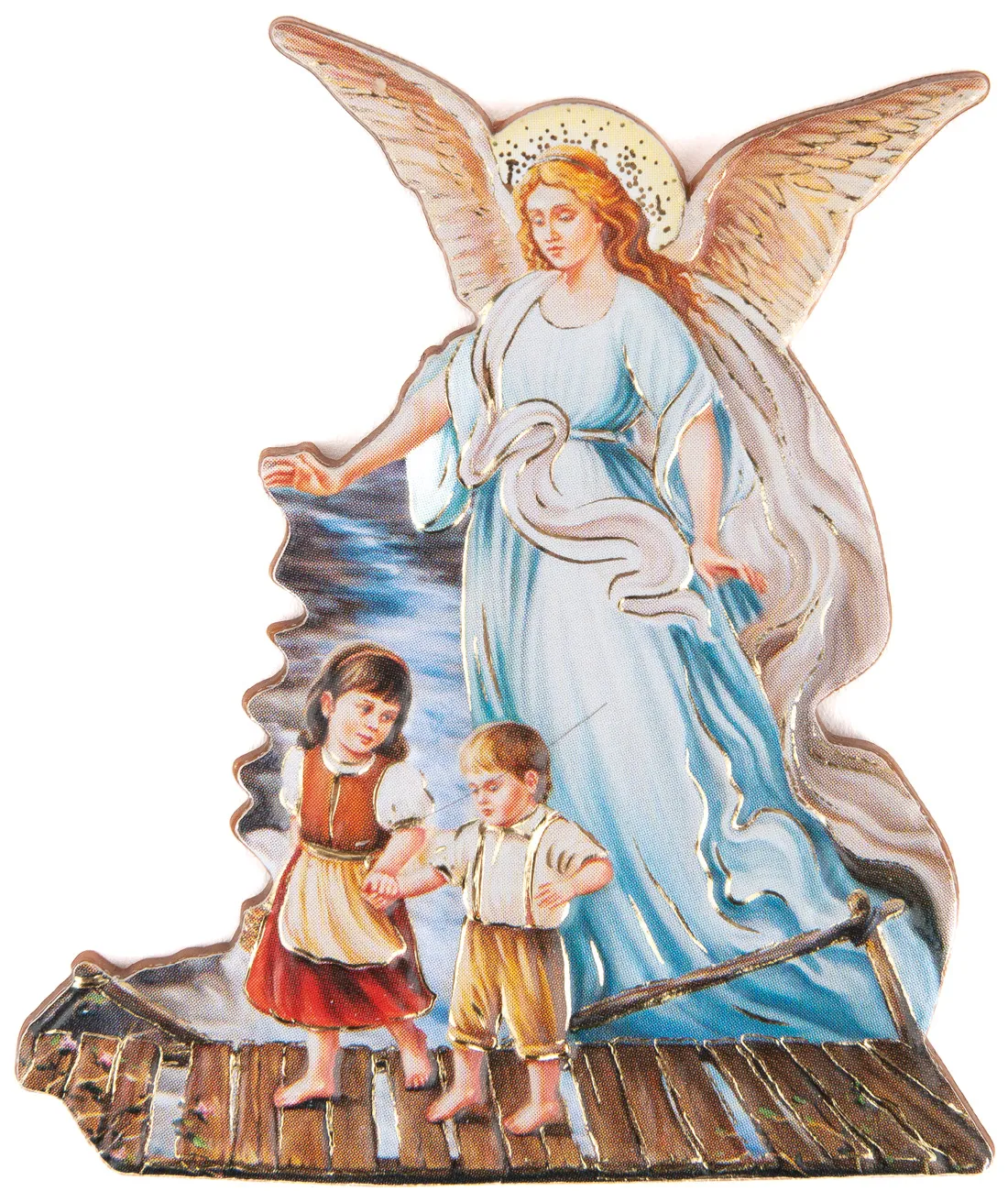 Dřevěná magnetka Anděla Strážného o velikosti 7 cm. Od svého počátku až k hodině smrti je lidský život obklopen ochranou andělů a jejich přímluvami. Každý věřící má u sebe anděla jako ochránce a pastýře, na kterého by neměl zapomínat.