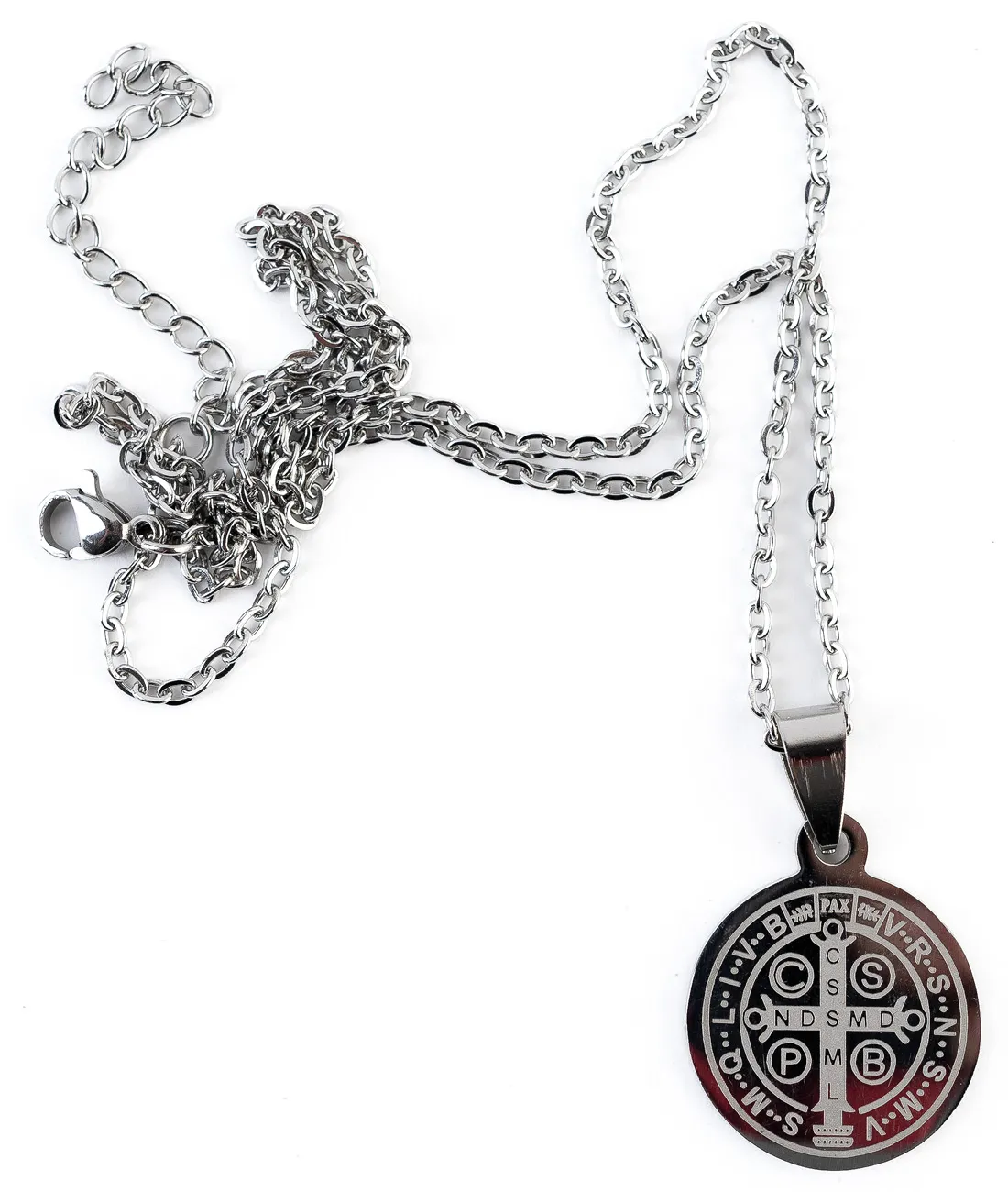 Medailka svatého otce Benedikta z ušlechtilého kovu na řetízku o průměru 2 cm.