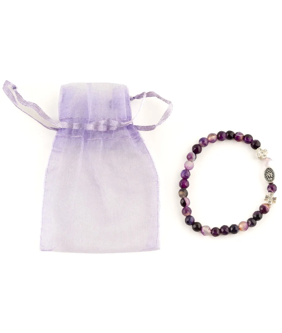 Náramek s broušenými fialovými korálky různých odstínů na gumičce a s křížky vykládanými zirkony, s medailkou Panny Marie Neposkvrněné