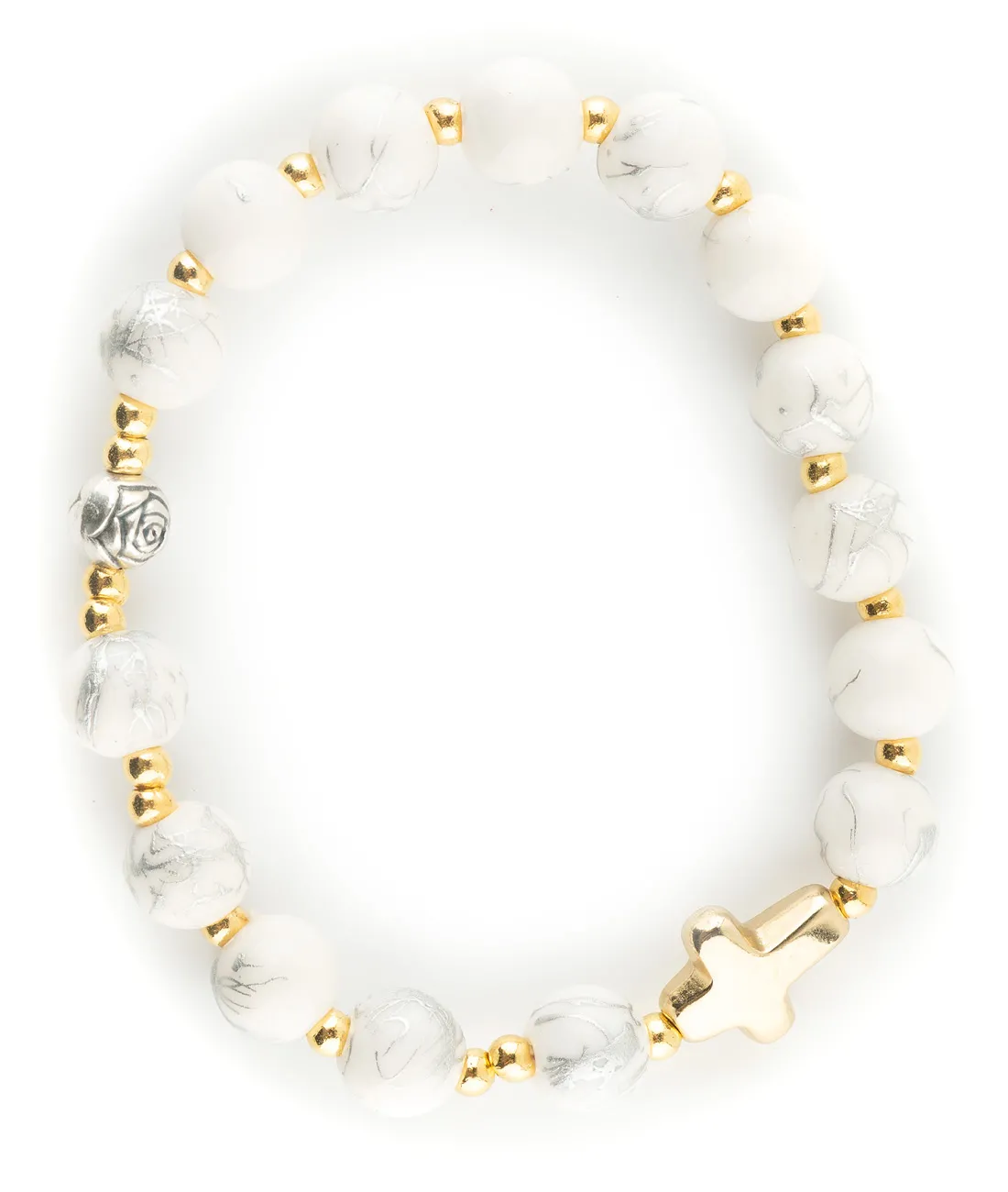 Růženec desátek s bíle žíhanými korálky na gumičce a s křížkem zlaté barvy