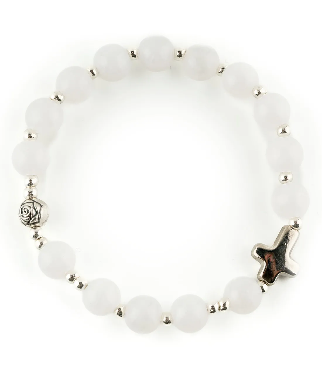 Růženec desátek s bílými korálky na gumičce a s křížkem stříbrné barvy