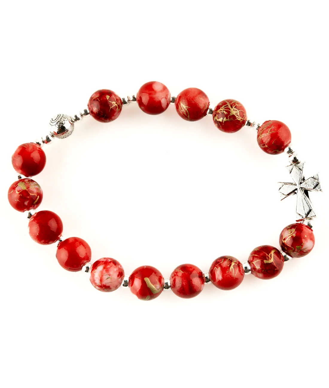 Růženec desátek s červeně žíhanými korálky na gumičce a s širším křížkem stříbrné barvy