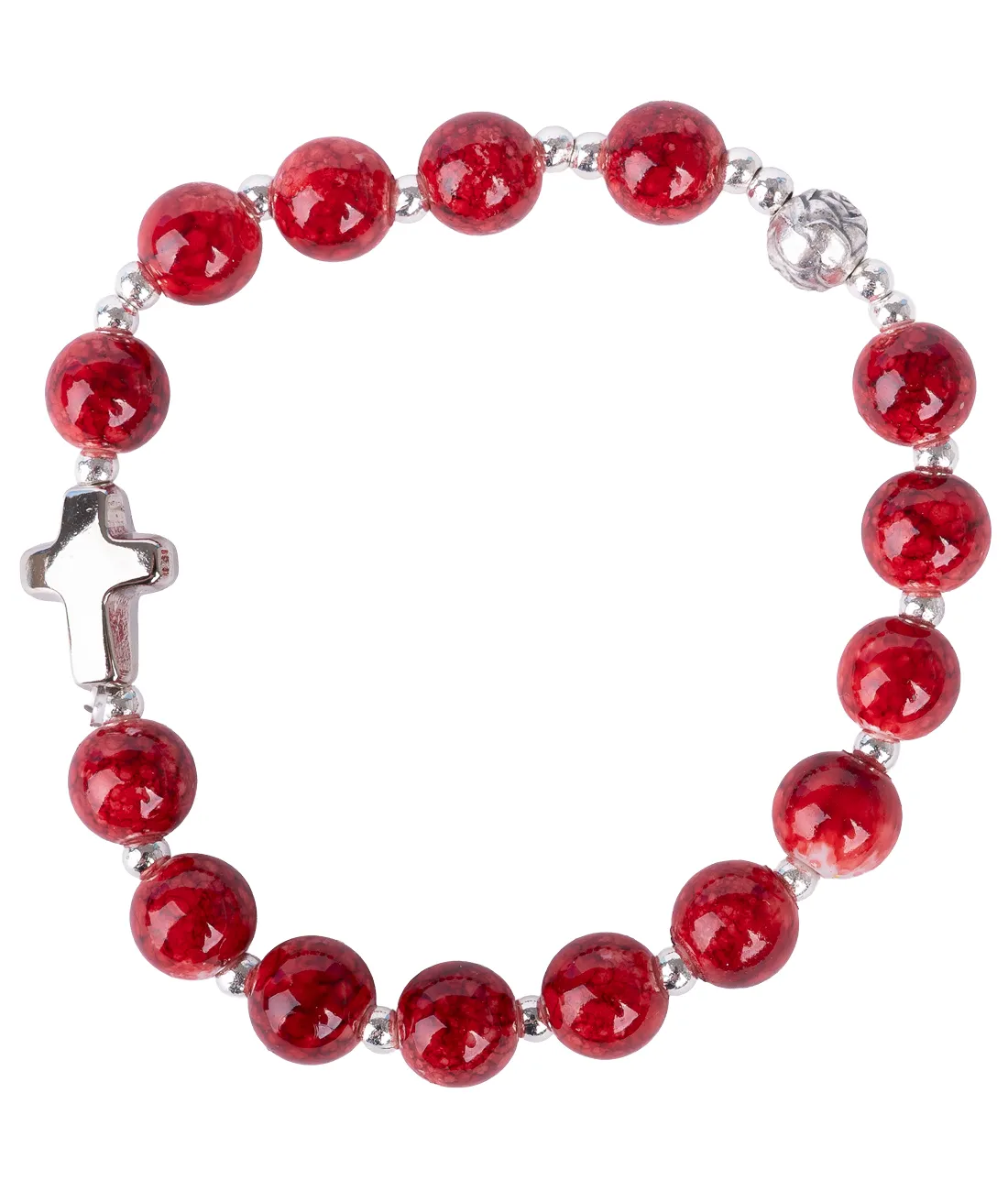 Růženec desátek s červenými žíhanými korálky na gumičce a s křížkem stříbrné barvy