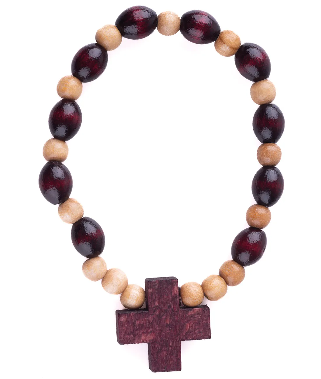 Praktický dřevěný růženec desátek jako náramek na gumičce. V kombinaci lakovaného dřeva v barvě bordó a světle hnědé s bordó křížkem o velikosti 2 cm.