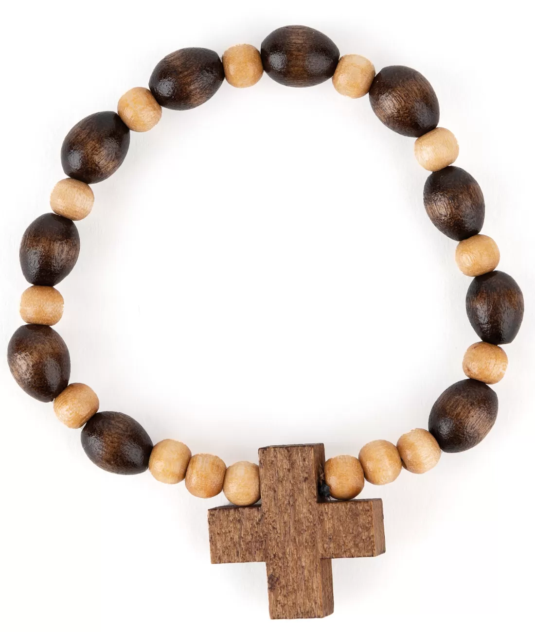 Praktický dřevěný růženec desátek jako náramek na gumičce. V kombinaci tmavého a světlého lakovaného dřeva a tmavým křížkem o velikosti 2 cm.