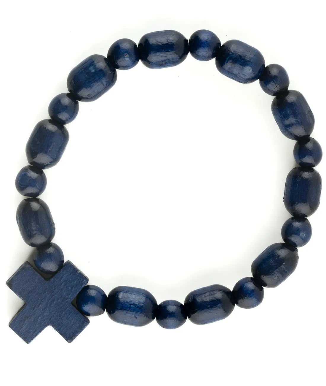 Praktický dřevěný růženec desátek jako náramek na gumičce. Celý náramek je z lakovaného dřeva v barvě modré, s křížkem o velikosti 2 cm.