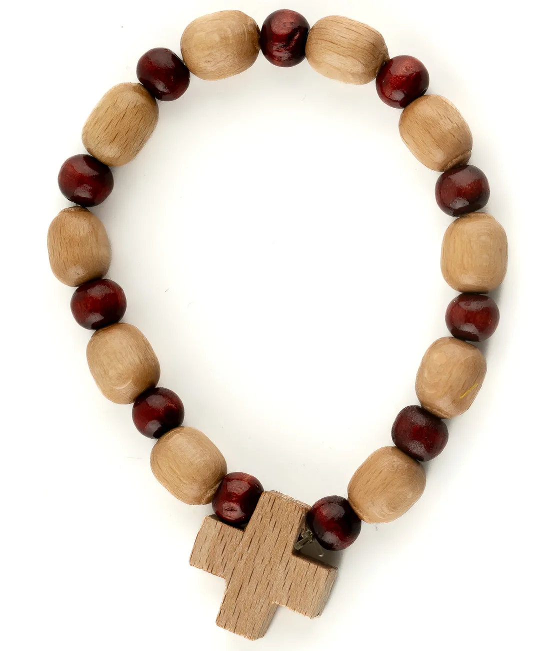 Praktický dřevěný růženec desátek jako náramek na gumičce. Celý náramek je z lakovaného dřeva v barvě přírodní a bordó, s křížkem v barvě přírodní o velikosti 2 cm.