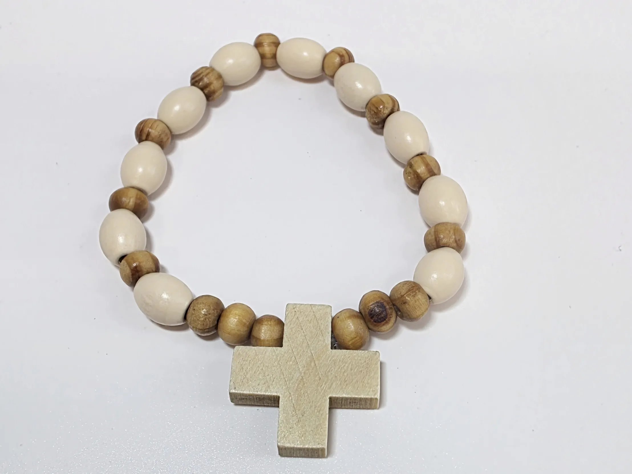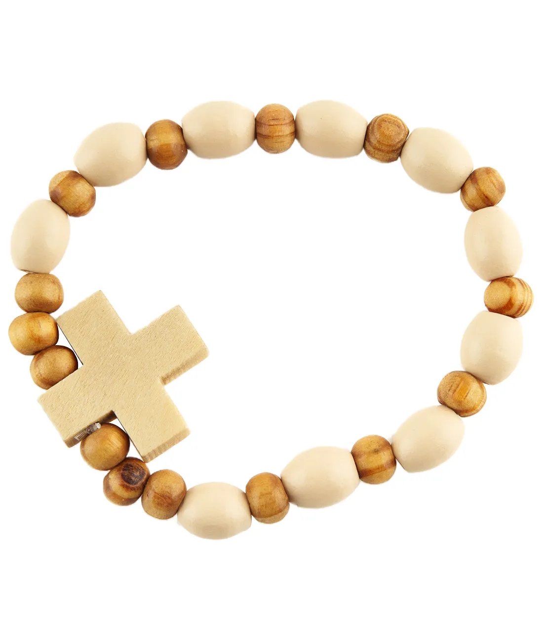 Praktický dřevěný růženec desátek jako náramek na gumičce. V kombinaci lakovaného dřeva ve světle hnědé a krémové barvě se světlým křížkem o velikosti 2 cm.