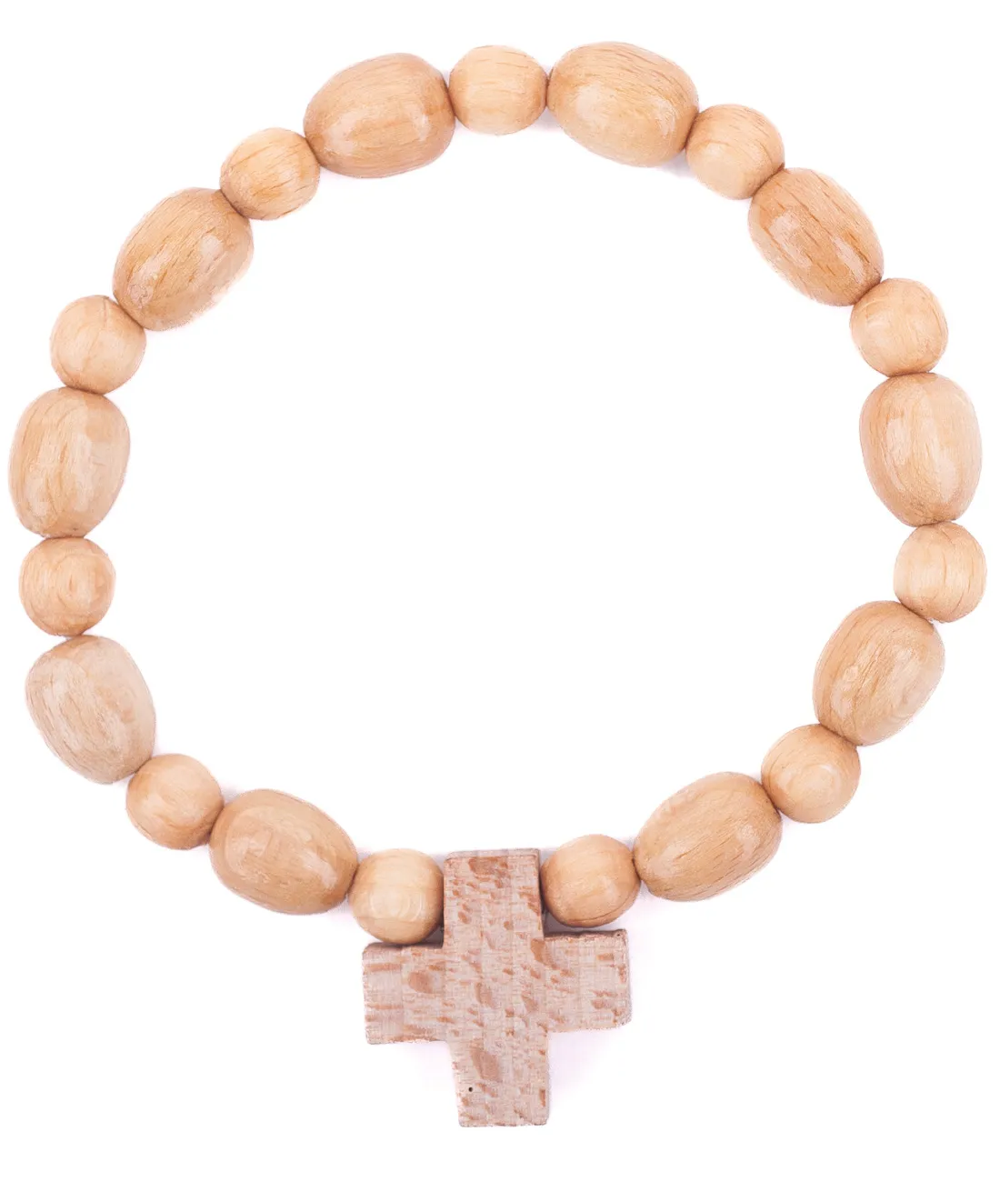 Praktický dřevěný růženec desátek jako náramek na gumičce.