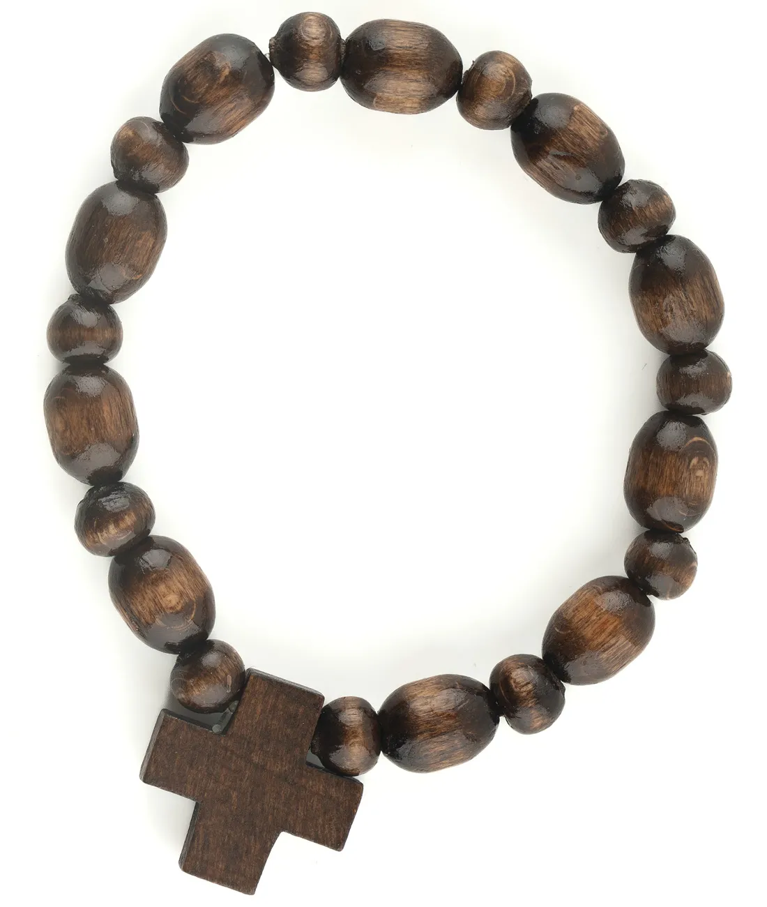 Praktický dřevěný růženec desátek jako náramek na gumičce. Celý náramek je z lakovaného dřeva v barvě tmavě hnědé, s křížkem o velikosti 2 cm.