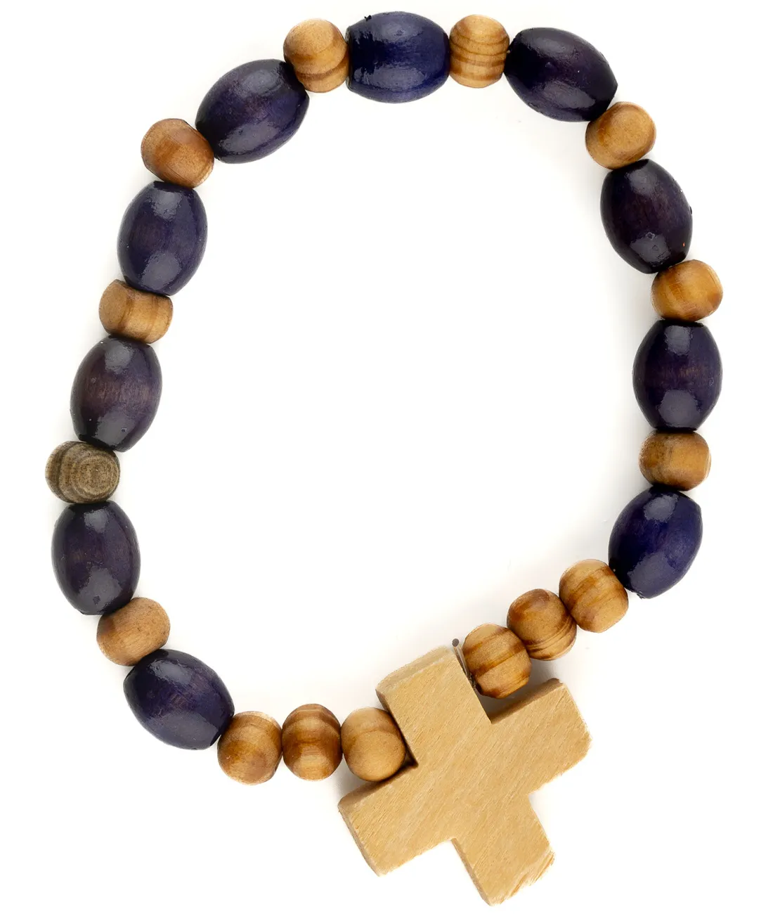Růženec desátek dřevěný se švestkově modrými korálky peckami na gumičce a s dřevěným křížkem světlé barvy