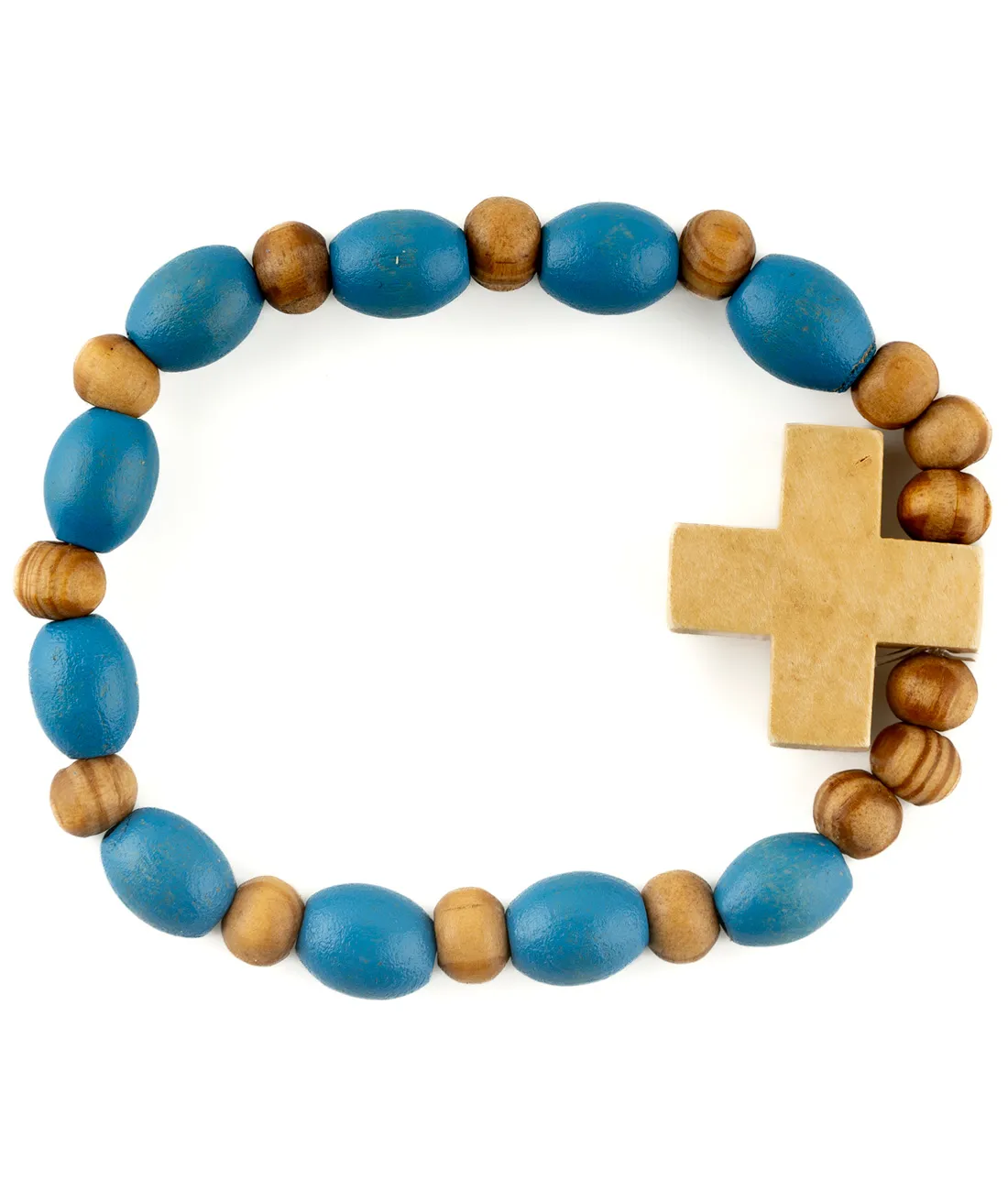 Růženec desátek dřevěný se světle modrými korálky peckami na gumičce a s dřevěným křížkem světlé barvy