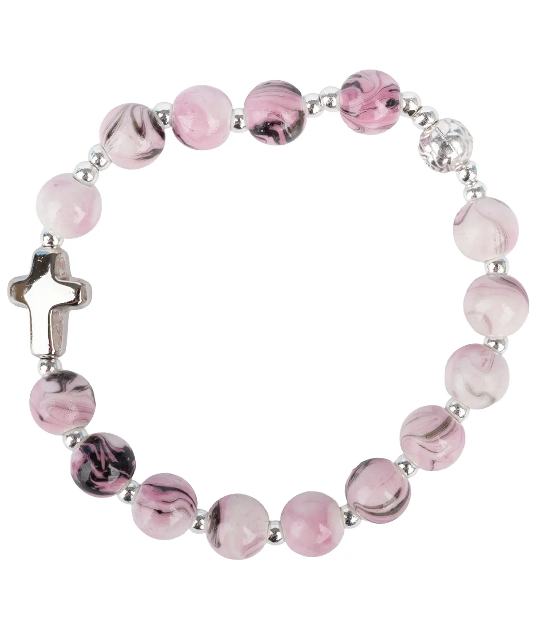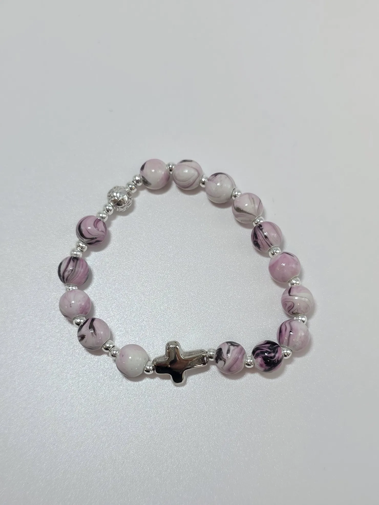 Růženec desátek s fialově žíhanými korálky na gumičce a s křížkem stříbrné barvy