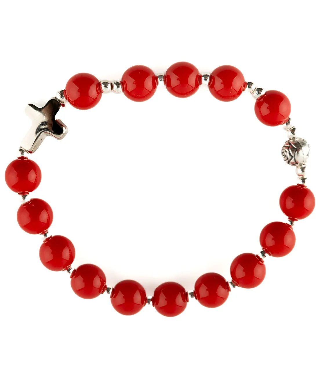 Růženec desátek s červenými korálky na gumičce a s křížkem stříbrné barvy