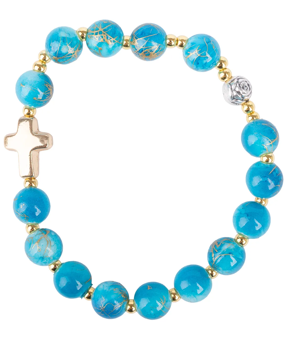 Růženec desátek s tyrkysovými žíhanými korálky na gumičce a s křížkem zlaté barvy