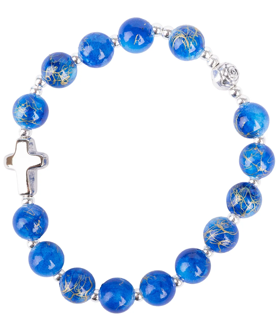 Růženec desátek s modrými žíhanými korálky na gumičce a s křížkem stříbrné barvy.