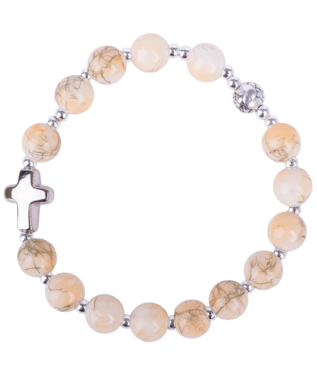 Růženec desátek s pískově žíhanými korálky na gumičce a s křížkem stříbrné barvy.