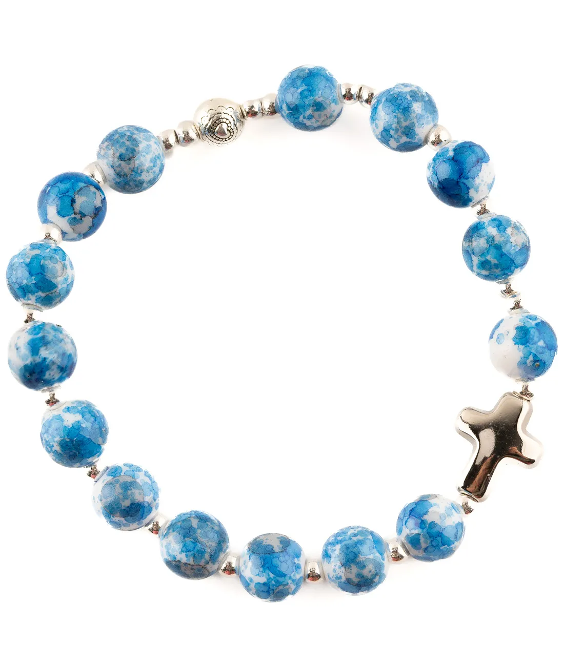 Růženec desátek s modrými žíhanými korálky na gumičce a s křížkem stříbrné barvy