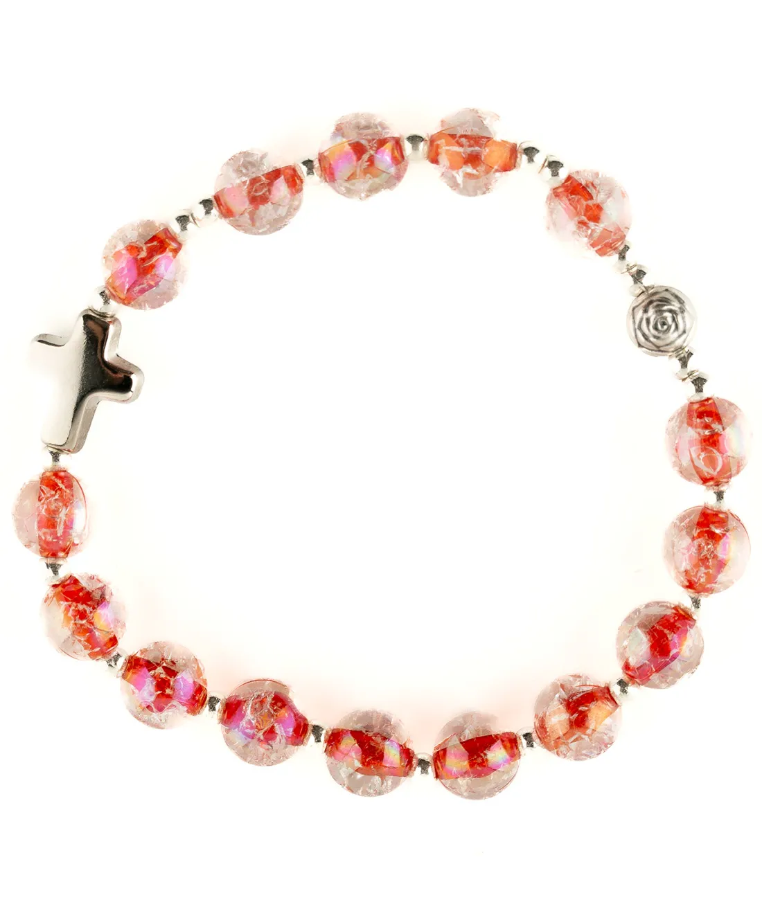 Růženec desátek s průhlednými žíhanými červenými korálky na gumičce a s křížkem stříbrné barvy