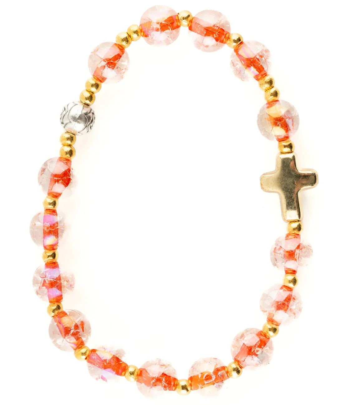 Růženec desátek s průhlednými korálky na gumičce a s křížkem zlaté barvy