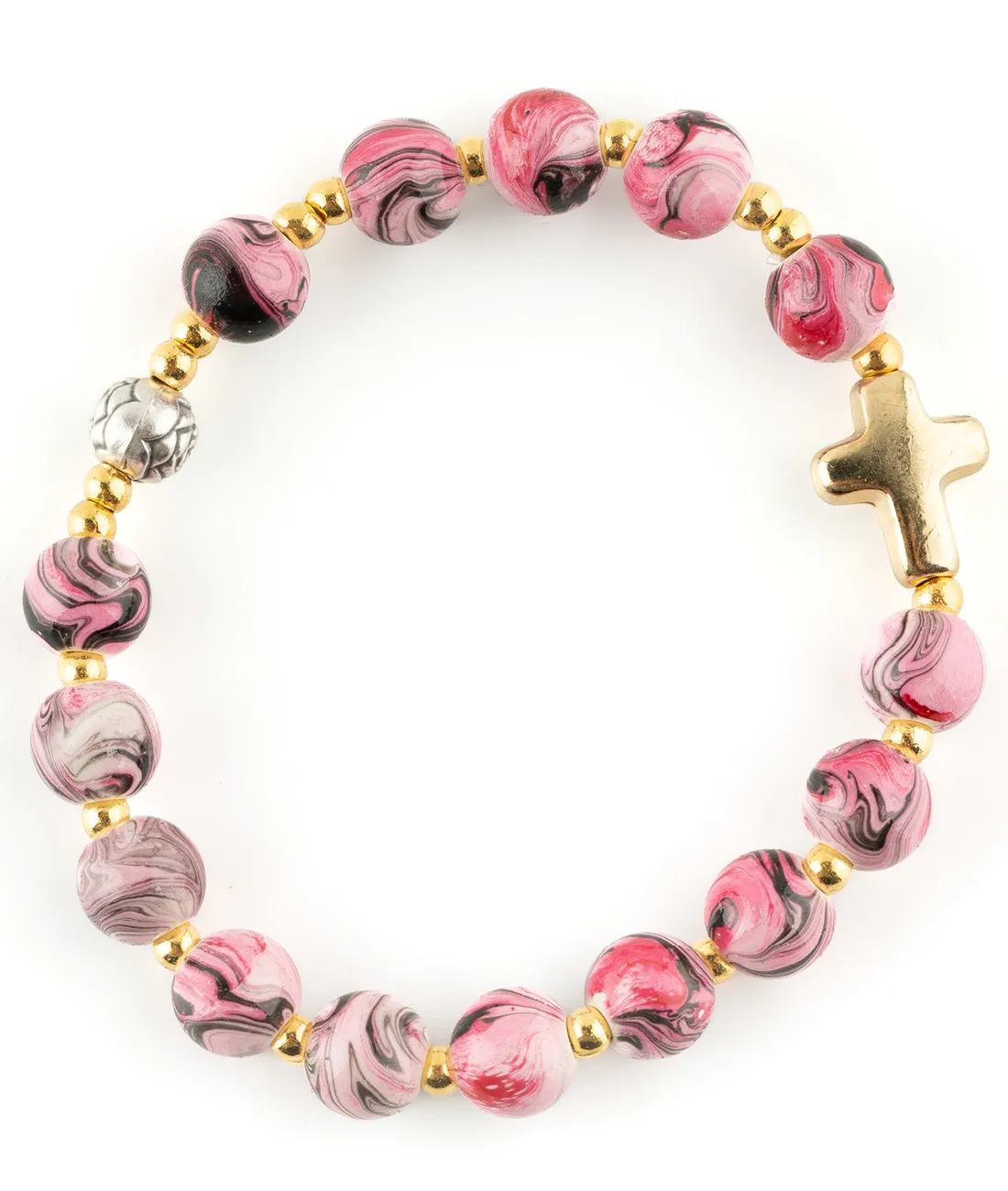 Růženec desátek s růžovými žíhanými korálky na gumičce a s křížkem zlaté barvy