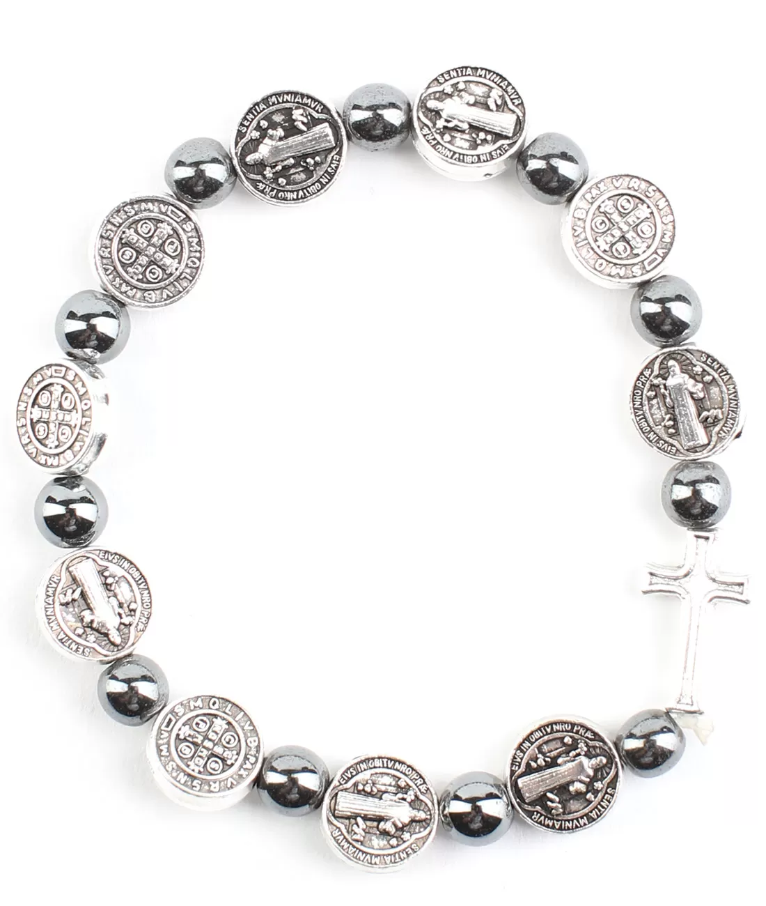 Růženec desátek s korálky z kamene hematitu a se stříbrnými medailemi sv. otce Benedikta a drobným křížkem. Hematit je lidem znám již od starověku. Využíval se jako talisman přinášející štěstí a poskytující ochranu. Od středověku je již obvyklé jeho použití ve šperkařství. Hematit je mezi lidmi běžně známý pod názvem krevel. Obvykle si jej představíme v šedočerné barvě s jako kovovým leskem, ale může mít i hnědou až červenou barvu. Symbolika medailky vychází z duchovních zkušeností sv…. Benedikta, který znamením kříže a modlitbou zažehnával mocnosti zla. Proto je na jedné straně vyobrazen kříž sv. otce Benedikta s počátečními písmeny modlitby exorcismu. Mezi rameny kříže proto nacházíme písmena C S P B: Crux Sancti Patris Benedicti – Kříž svatého otce Benedikta. Na svislém břevnu C S S M L: Crux Sancta Sit Mihi Lux – Svatý kříž mi buď světlem. Na příčném břevnu N D S M D: Non Draco Sit Mihi Dux – Drak (tj. ďábel) ať mi není vůdcem. Na lemu kolem kříže jsou písmena V R S N S M V S M Q L I V B: Vade Retro Satana Numquam Suade Mihi Vana Sunt Mala Quæ Libas Ipse Venena Bibas – Odstup dále Satane a nikdy mi neraď. Marné je zlo, které nabízíš, ten jed si vypij sám. Na druhé straně je pak vyobrazen samotný světec doprovázen textem: Eius in obitu nostro praesentia muniamur! – Jeho (Benediktova) přítomnost ať nás chrání při našem umírání.