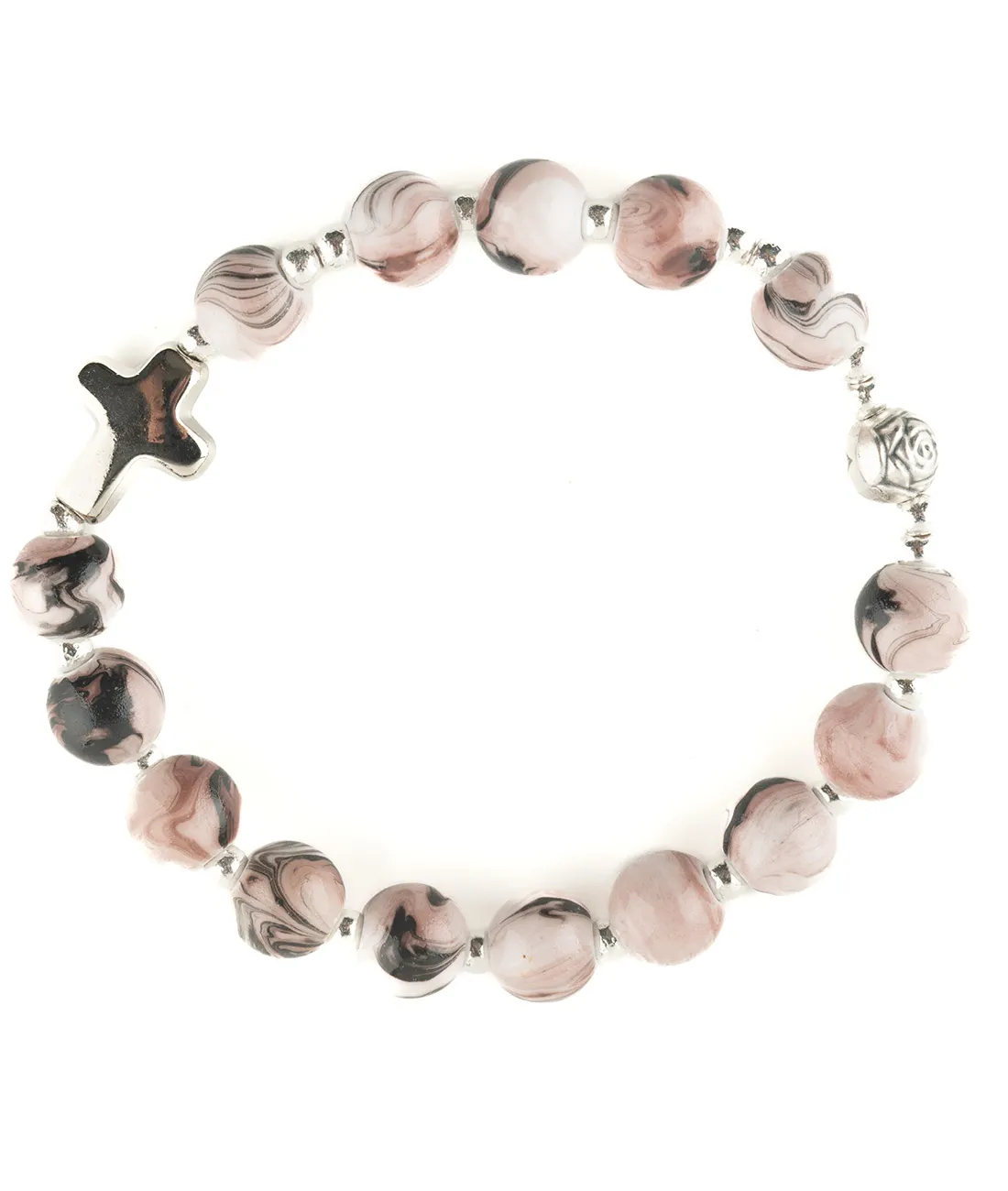 Růženec desátek se starorůžově žíhanými korálky na gumičce a s křížkem stříbrné barvy